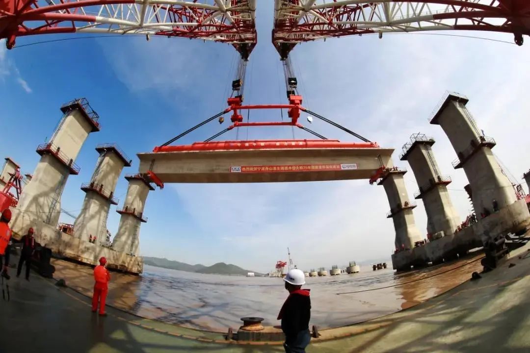 2019年4月18日,寧波舟山港主通道舟岱大橋建設迎來激動人心的時刻:長69米、寬12.55米、重達1800余噸的“巨無霸”箱梁安全、精準地落至大橋NZ24號和NZ25號墩上,該項目專用吊具由巨力索具研發生產。