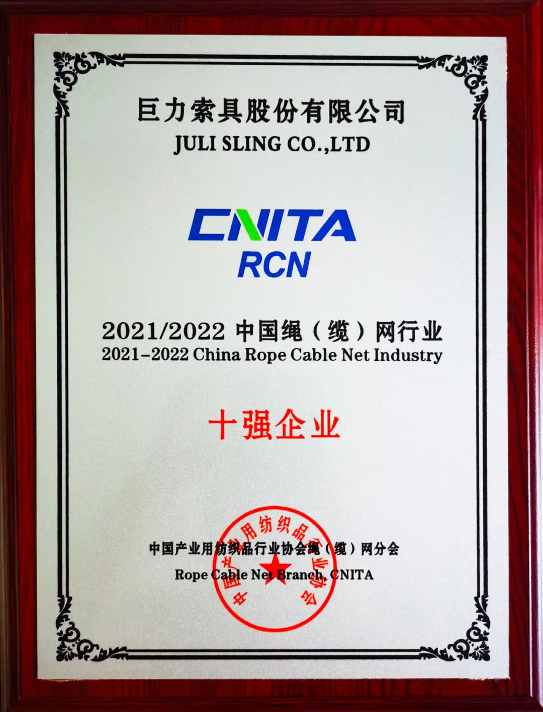 巨力索具榮獲“2021/2022中國繩(纜)網行業十強企業”