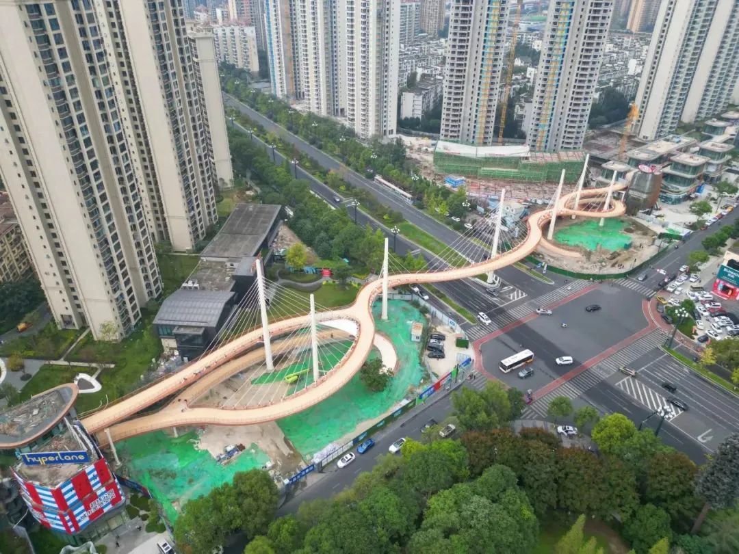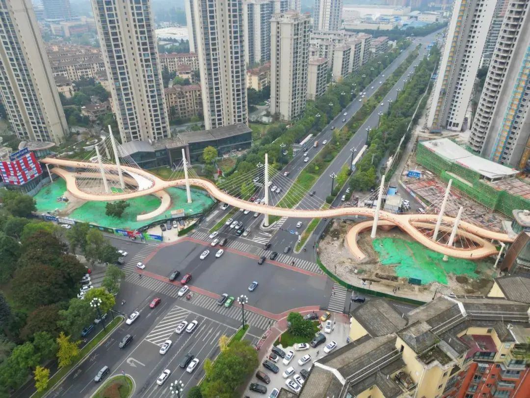 蜀龍路跨線橋主線全長(zhǎng)249.6米,共包含7根索塔、100根鋼索以及24節(jié)段鋼箱梁。全橋采用鋼結(jié)構(gòu)實(shí)現(xiàn)靈動(dòng)造型,沒有一座橋墩,通過7根索塔拉起1000余噸橋體。