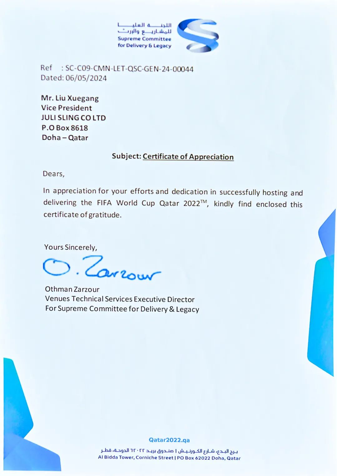 隨著2024年溫暖的春意,我們收到了來自項目業(yè)主——卡塔爾交付和遺產(chǎn)最高委員會(SUPREME COMMITTEE FOR DELIVERY & LEGACY)的感謝信及認(rèn)可證書,這是對我們過往努力的最佳肯定。信中的每一個字句,都是對我們團(tuán)隊辛勤工作和不懈努力的高度認(rèn)可。這份榮耀不僅屬于我們,也屬于每一位支持和關(guān)注我們項目的人。您們的信任和支持是我們最寶貴的財富,是我們不斷前進(jìn)的動力源泉。