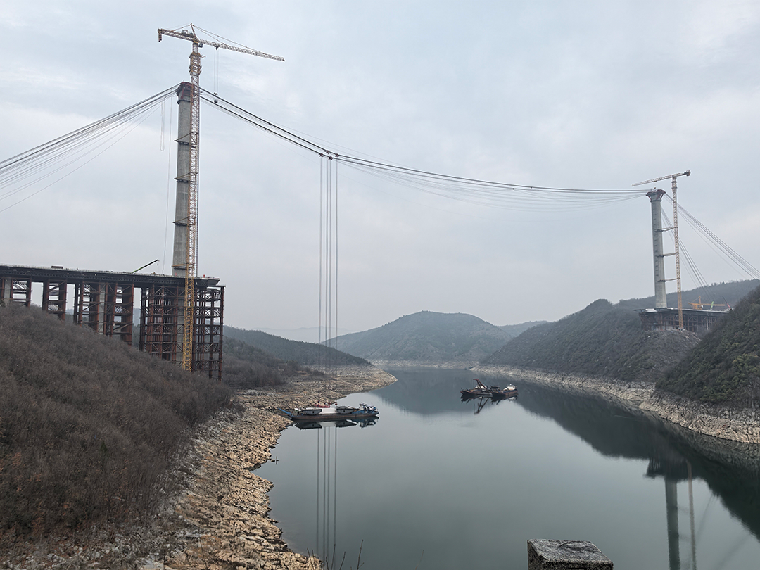 丹江小三峽特大橋地處鄂豫交界的丹江口水庫庫區,是連接南北交通的重要節點工程。大橋全長919米,主跨536米,是目前國內最大跨徑跨峽谷分離式混合梁斜拉橋,橫跨陡峭峽谷,施工環境復雜,傳統吊裝設備難以滿足高空、大跨度、重載荷的作業需求。巨力索具針對項目特點,量身定制了雙塔三跨式纜索起重機系統,其跨度、起重量及智能化控制水平均達到行業領先標準。
