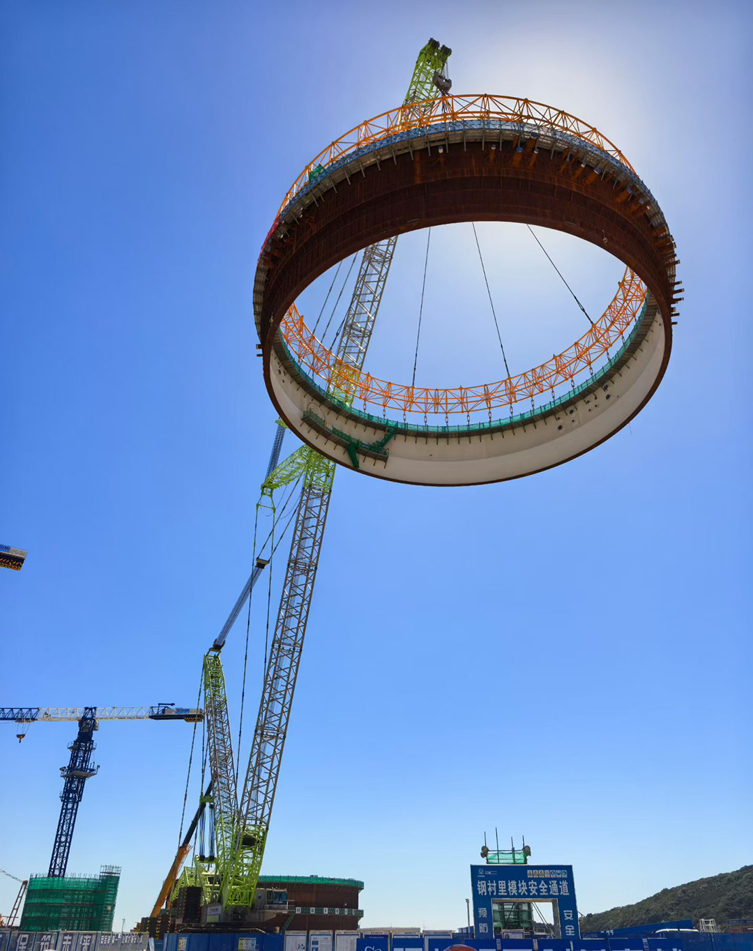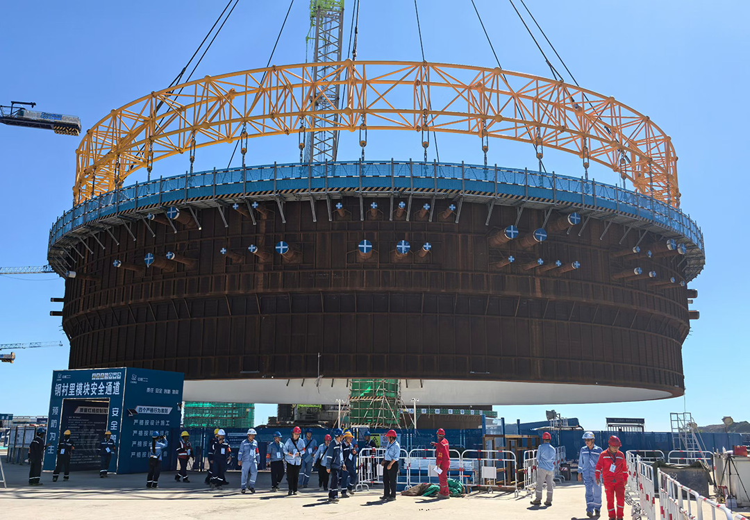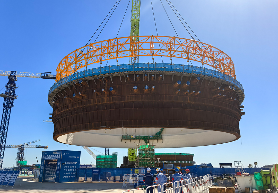 9月28日,金七門核電1號機組鋼結構安全殼鋼襯里模塊一平穩落位,首個大型模塊吊裝任務圓滿完成。此次吊裝采用了以巨力索具環形吊具為代表的先進吊裝技術,實現了安全精準的吊裝作業。